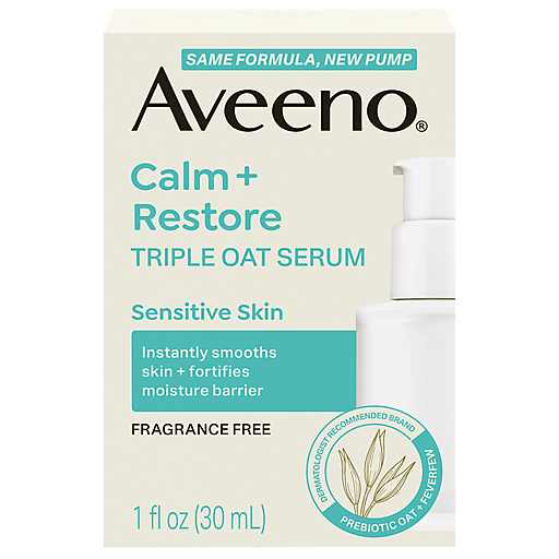 Aveeno Calm + Restore Triple Oat Serum designed for sensitive skin with nourishing oat goes beyond soothing & restores skin's natural moisture barrier. The hydrating face serum absorbs quickly & leaves sensitive skin feeling soothed & hydrated after just one use. In fact, 92% agreed skin felt instantly smooth. Lightweight serum with a Triple Oat Complex soothes & nourishes skin plus calming feverfew, known to effectively calm skin. The hypoallergenic, non-comedogenic formula has been tested on sensitive skin & is free of fragrances, parabens, phthalates, dyes & alcohols. From a dermatologist-recommended brand for over 70 years, Aveeno Calm + Restore Triple Oat Facial Serum now in a convenient pump bottle leaves skin feeling soft and supple. To use in your daily skincare routine, apply a dime size amount onto a dry, clean face before moisturizing.
