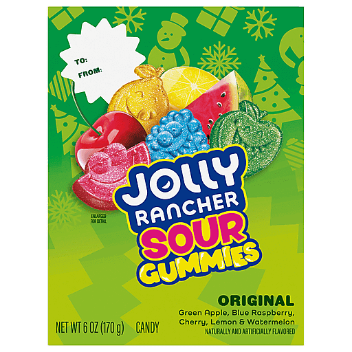A mix of five sour fruity favorites for the whole family in just one box of chewy gummies? You wouldn't have thought it possible if you didn't know JOLLY RANCHER gummies Christmas candy. This gift box of sour fruit flavored gummies offers fun, flavorful fruity shapes that every member of the family will be happy to choose from this holiday season. Featuring blue raspberry, green apple, cherry, lemon and watermelon flavors, JOLLY RANCHER gummies offer a combination of the undisputed original flavor classics you know and love. Grab a few gift boxes for last-minute gifting to friends, co-workers or family members — but don't forget to save a box or two of sweet and sour gummies for yourself during all of that sharing! These fruit flavored candies make the perfect covered Christmas candy bowl display, thanks to vibrant colors and attractive JOLLY RANCHER fruit shapes. They're also great treats for stuffing festive Christmas stockings, filling holiday gift bags and adorning gingerbread houses this holiday season. If you want a small candy with a big, sour fruity taste to keep your taste buds busy during festive movie nights, lunch hours, snack breaks and more, JOLLY RANCHER chewy gummies are the treat for you.