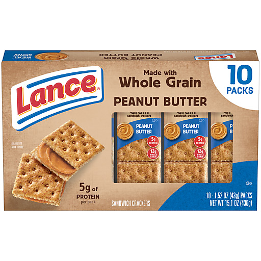 Enjoy a satisfying snack on the go, anytime, with Lance Made with Whole Grain Peanut Butter Crackers. Baked with whole grain and made with real peanut butter filling, they come in convenient packs that can be taken with you anywhere. Enjoy this flavorful and portable snack for the whole family. Bring it!