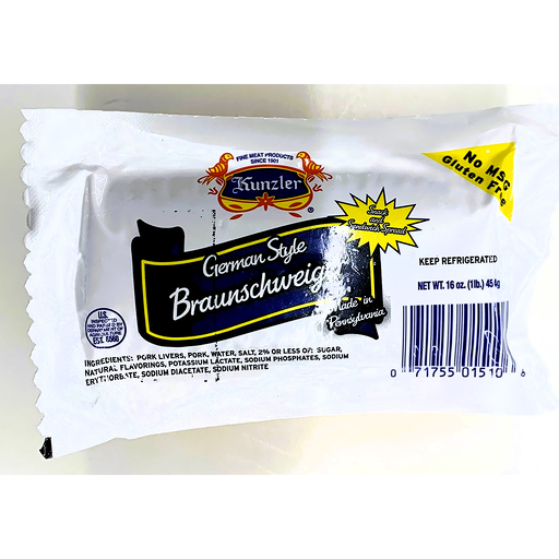 Kunzler German Style Braunschweiger 16 Oz.Kunzler® German Style Braunschweiger. Fine meat products since 1901. No MSG. Gluten free. Snack and sandwich spread. U.S. inspected and passed by Department of Agriculture. Est. 8560.