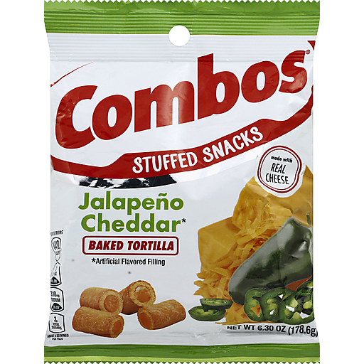 Baked tortilla. Made with real cheese. Jalapeno cheddar (artificial flavored filling). Crunchy corn tortillas bursting with spicy jalapeno and cheddar cheese flavor. We've taken Tex-Mex to the Tex-Max. Stuffed full of awesome. An official partner of Nascar. Per Serving: 140 calories; 3 g sat fat (13% DV); 310 mg sodium (13% DV); 3 g total sugars. About 6 serving per serving. For more fun visit www.combos.com. We value your questions or comments. Call 1-800-558-7881 or visit us at www.combos.com. Please save the unused product and wrapper. Partially produced with genetic engineering.