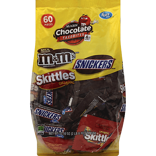 & more! Milk Chocolate M&M's Chocolate Candies Brand. Snickers Brand. Skittles Original Bite Size Candies. What's Inside: 60 to 80 calories (3% to 4% DV) per piece. Real chocolate. M&M's Brand Fun Size Milk Chocolate Candies: What's Inside - Per Fun Size Pack: 60 calories (3% DV); 2.5 g total fat (4% DV); 1.5 g sat. fat (8% DV); 9 g sugars (No DV defined); 10 mg sodium (0% DV). Snickers Brand Fun Size Bars: What's Inside - Per Fun Size Pack: 80 calories (4% DV); 4 g total fat (6% DV); 1.5 g sat. fat (8% DV); 9 g sugars (No DV defined); 40 mg sodium (2% DV). Skittles Original Bite Size Candies: What's Inside - Per Fun Size Pack: 60 calories (3% DV); 0.5 g total fat (1% DV); 0.5 g sat. fat (3% DV); 11 g sugars (No DV defined); 0 mg sodium (0% DV). GDA's are based on a 2,000 calorie diet. To learn more visit www.marshealthyliving.com. Gluten-free, gelatin-free. We value your questions or comments. Call 1-800-651-2564. Please save the unused product and wrapper.